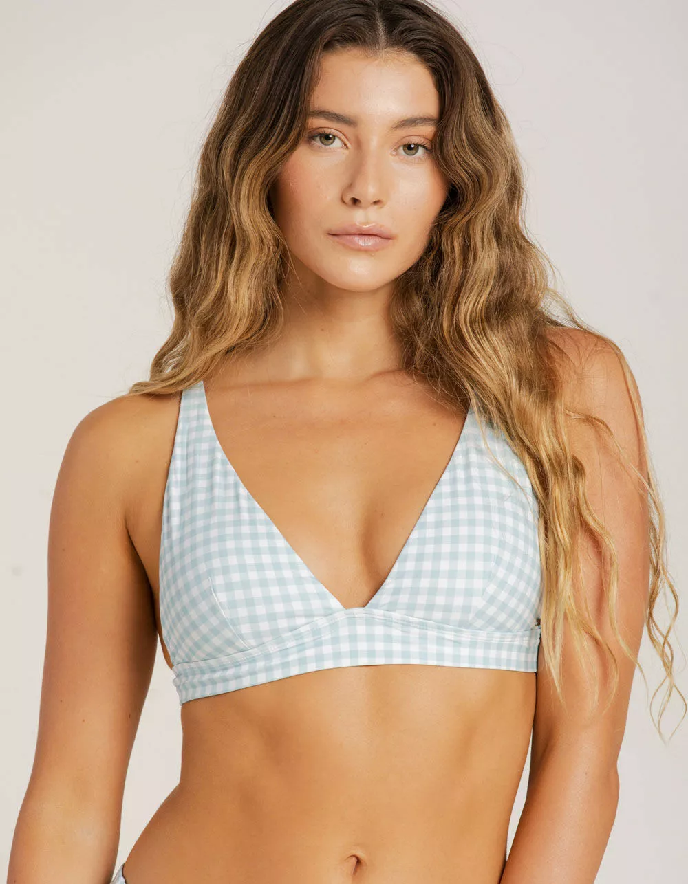 Rip Curl Gingham Triangle Bikini Top. Allover print. Adjustable back tie. Removeable bra pads. 85% Polyamide, 15% Elastane. Lining: 100% Polyester. Hand wash. Imported.