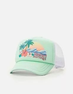 Rip Curl Tide Trucker Hat. The Tide Trucker Hat is a great beach cap featuring traditional design with curved peak, high structured crown, and mesh back with snap adjuster. Graphic on front. Woven label at closure. Imported.