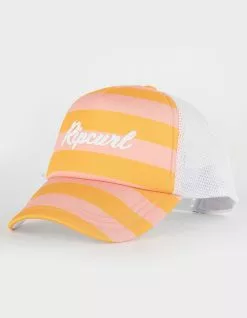 Rip Curl Vacation Club Trucker Hat. The Vacation Club Trucker Hat is a great beach cap featuring traditional design with curved peak, high structured crown, and mesh back with snap adjuster. Foam front featuring Rip Curl script. 100% Polyester. Imported.