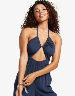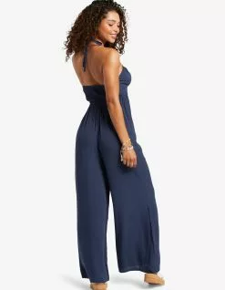 Roxy Away On Vacay Wide Leg Jumpsuit. Made of eco-conscious moss crepe fabric (so it’s perfect for travel), the Away On Vacay jumpsuit has a wide leg and a strappy halter neck you can tie multiple ways. In a navy jewel tone, it’s a true slip-it-on-instantly-look-cute holiday essential. Wide leg fit. Adjustable multi way neckline. Elastic waist. Adjustable halter neck ties and smocked back. 100% Viscose. Imported.