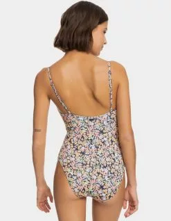 Roxy Beach Classics One-Piece Swimsuit. Made of recycled stretch fabric, this printed Beach Classics swimsuit takes a twist on a classic one-piece with an eye-catching front opening and an adjustable tie closure. Plunge neck. Adjustable rings and sliders straps. Removable bra pads. Medium, high leg coverage. Roxy rubber plate branding. Opening at front with drawstring panels and spaghetti bow. 87% Recycled Nylon, 13% Elastane. Hand wash. Imported.