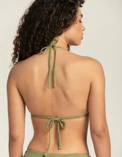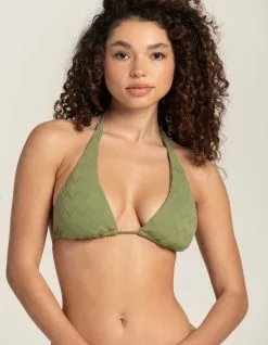 Roxy Current Coolness Elongated Triangle Bikini Top. Made of ultra-luxe recycled jacquard fabric, the Current Coolness textured triangle bikini top is fully adjustable with ties at the neck and back. Halter neck. Low support. Moderate coverage. Removeable bra pads. Rubber plate branding. 91% Recycled Nylon, 9% Elastane. Lining: 100% Polyester. Hand wash. Imported.