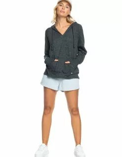 Roxy Destination Surf Hoodie. Combining an easy fit and comfy slub fabric, this knit pullover hoodie is your post-surf sidekick with a kangaroo pouch pocket and twisted tassel drawcords. V-neck placket. Long sleeve. Roxy metal plate. 55% Cotton, 45% Polyester. Machine wash. Imported.