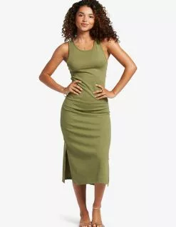 Roxy Good Keepsake Strappy Midi Dress. Made in soft and stretchy jersey fabric, this comfy midi dress elevates a fitted silhouette with an eye-catching open back and cross-strap detail. Regular fit. Scoop neck. Side slits on left and right side. Calf length. 97% Polyester, 3% Elastane. Machine wash. Imported.