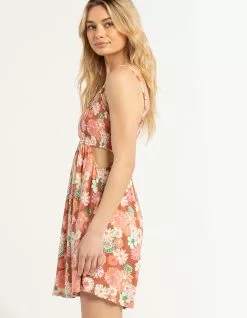 Roxy Hot Tropics Mini Dress. Allover floral print. V-neckline. Smocked bodice and back. Adjustable spaghetti straps. Side cutouts at waist. Approx. length: 33”. 100% Viscose. Machine wash. Imported.