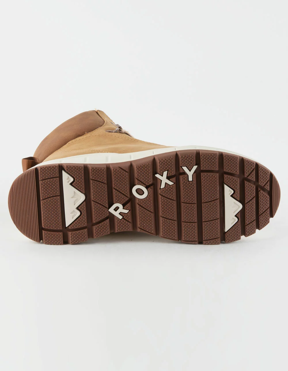 Roxy Karmel Lace-Up Boots. Roxy DryFlight® 5K with Scotchgard™ treated materials. Roxy WarmFlight® with 200 gram thermal insulation weather rated to -40 degrees C/-40 degrees F. Water resistant treated vegan-friendly leather. Lace up with metal eyelets and D-rings, gusseted tongue with padded collar. Polyester heathered laces. Faux fur lined shaft and footbed with Roxy woven label. Waterproof rubber cupsole with aggressive Roxy Alpine lug bottom. Imported.
