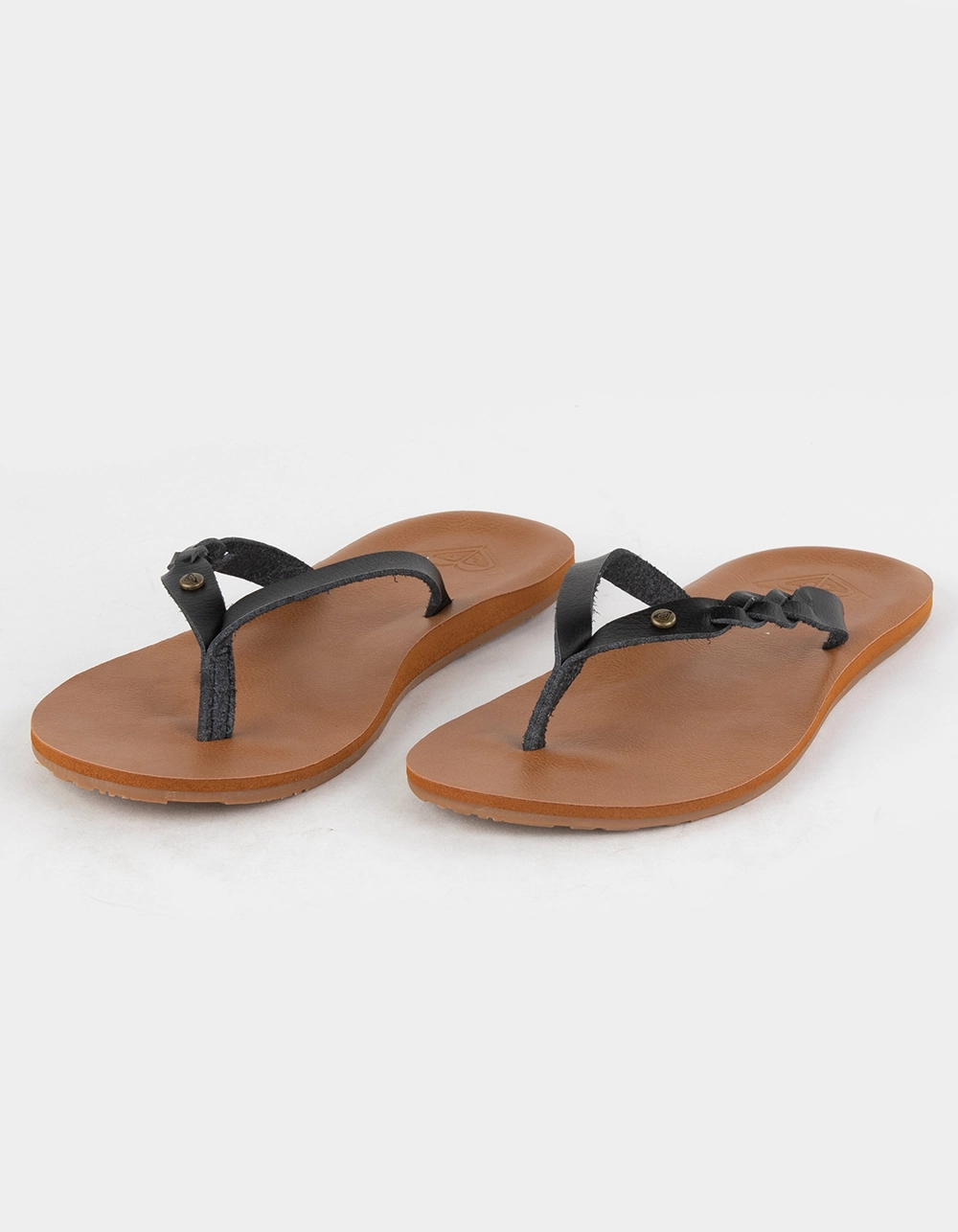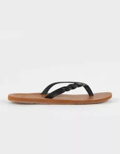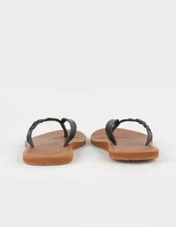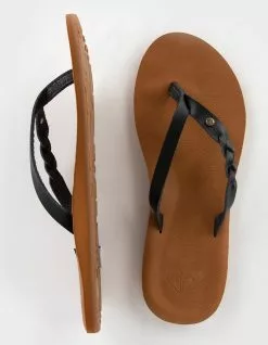 Roxy Liza Thong Sandals. Subtle braiding details the upper strap of these faux leather thong sandals. The contoured footbed delivers all-day comfort thanks to its ultra-soft construction and rubber outsole. Synthetic upper fabric. Rubber outsole. Roxy metal logo pin. Embossed Roxy heart. Roxy heritage floral art. Upper: 95% Synthetic, 5% Metal. Outsole: 100% TPR. Imported.