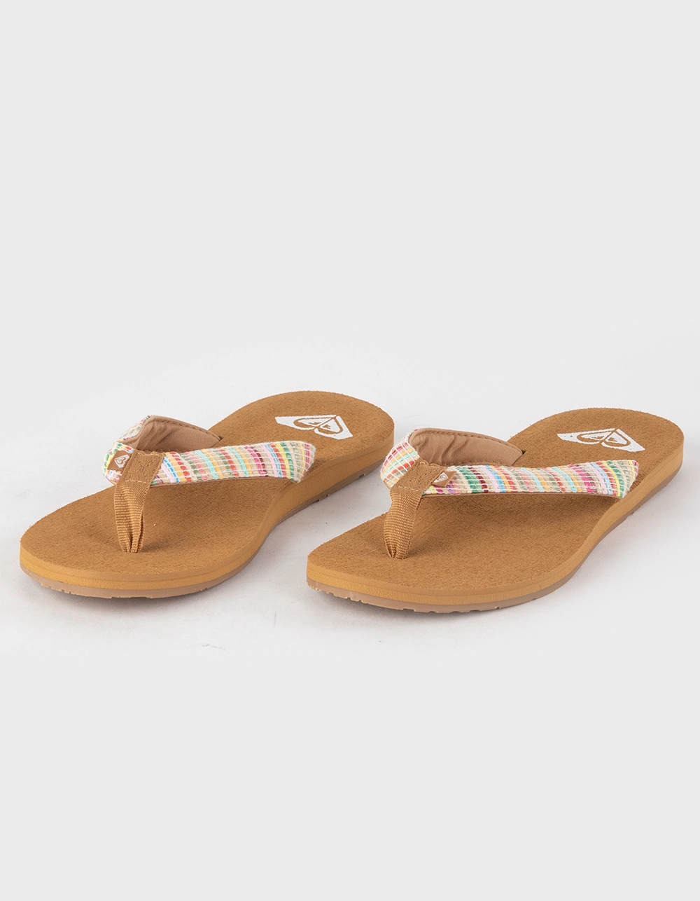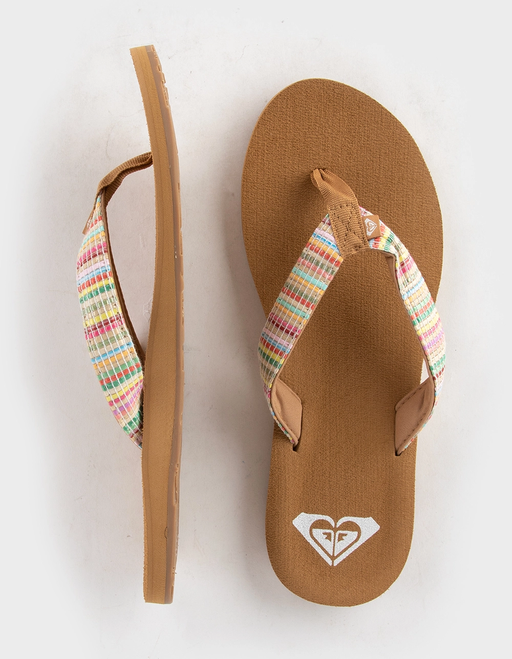 Roxy Porto Raffia Thong Sandals. With braided raffia upper and a contoured footbed, these Roxy fitness thong sandals strike the perfect balance of comfort and beachy style. Rubber for traction on wet and dry surfaces. Roxy heritage art on heel. Upper: 100% Synthetic Raffia. Lining: 100% Polyester. Outsole: 100% TPR. Imported.