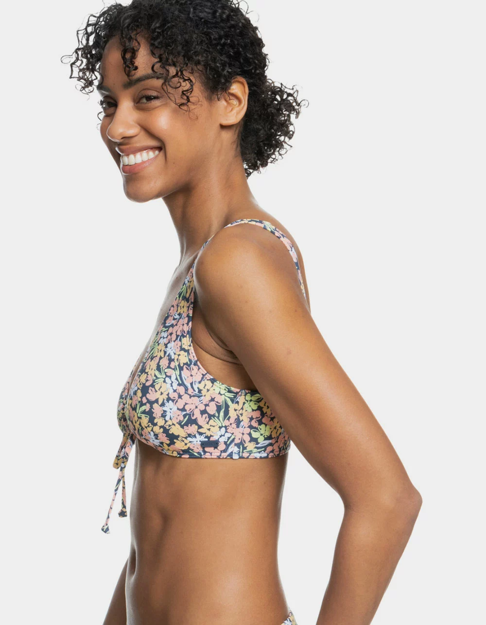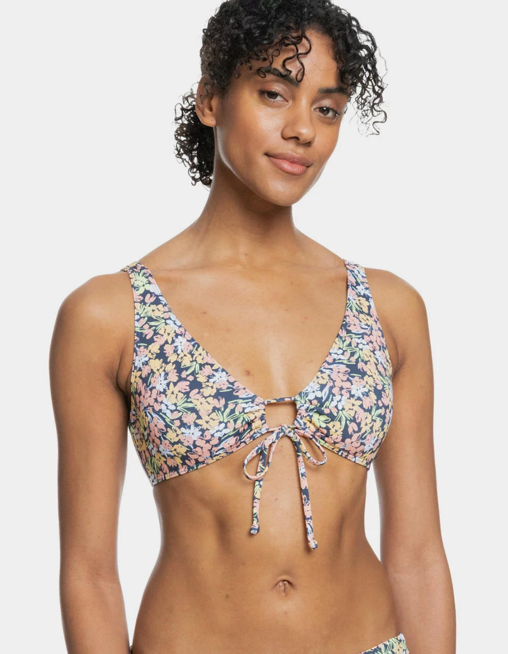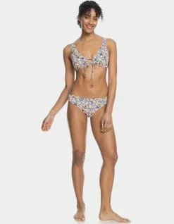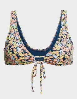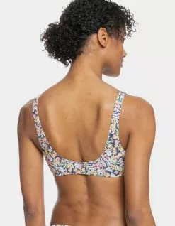 Roxy Printed Beach Classics Bralette Bikini Top. Made of recycled stretch fabric, this printed Beach Classics bralette bikini top has a comfortable scoop neckline and a drawstring tie at the front. Elongated shape. Scoop neck. Fixed straps. Regular support. Removeable bra pads. Hook with 3 holes for multiple back length possibility. Moderate coverage. Roxy rubber plate branding. Drawstring at front. 87% Recycled Nylon, 13% Elastane. Hand wash. Imported.
