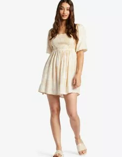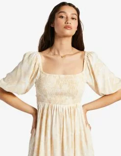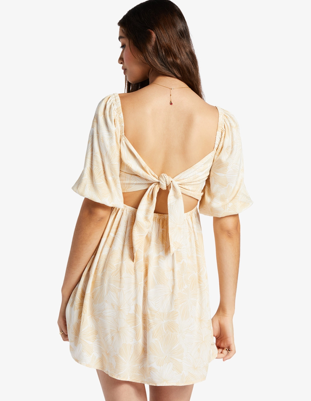 Roxy Satin Sands Mini Dress. Combining puff sleeves with a flowy skirt and a beachy print, this printed mini dress is a cute and comfy look for any occasion. Short length dress. Square neckline. Fitted fit. Puffy sleeves with elasticated cuffs and slight gather. Eco print. Smocked through body with A-line skirt. 100% Viscose. Machine wash. Imported.
