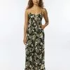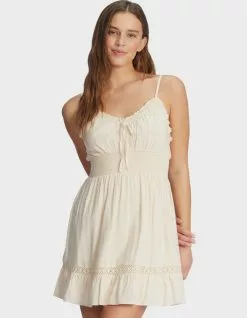 Roxy There She Goes Mini Dress. Scoop neckline with tie detailing at center. Ruffle trim. Adjustable spaghetti straps. Smocked waist. Crochet detailing near hem of skirt. Built in lining. Approx. length: 33.5”. 100% Viscose. Machine wash. Imported.