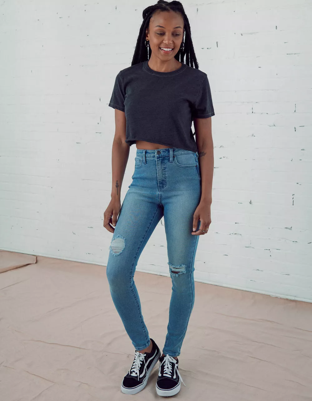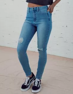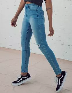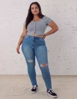 RSQ Curvy High Rise Skinny Jeans. Stretchy denim skinny jeans. 5-pocket styling. Fitted throughout. Distressing at front. High rise waist. Logo patch at back right waist. Button waist and zip fly.