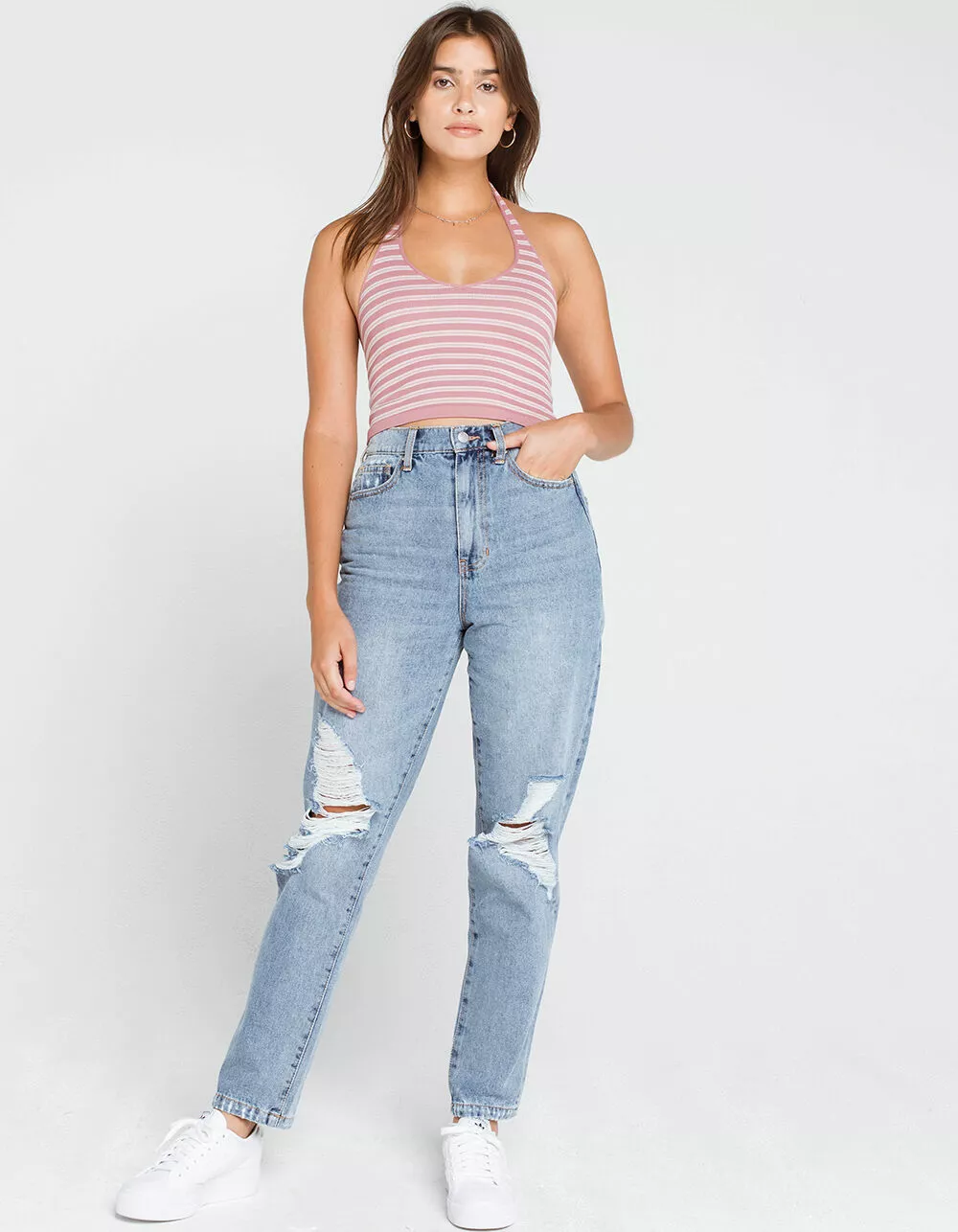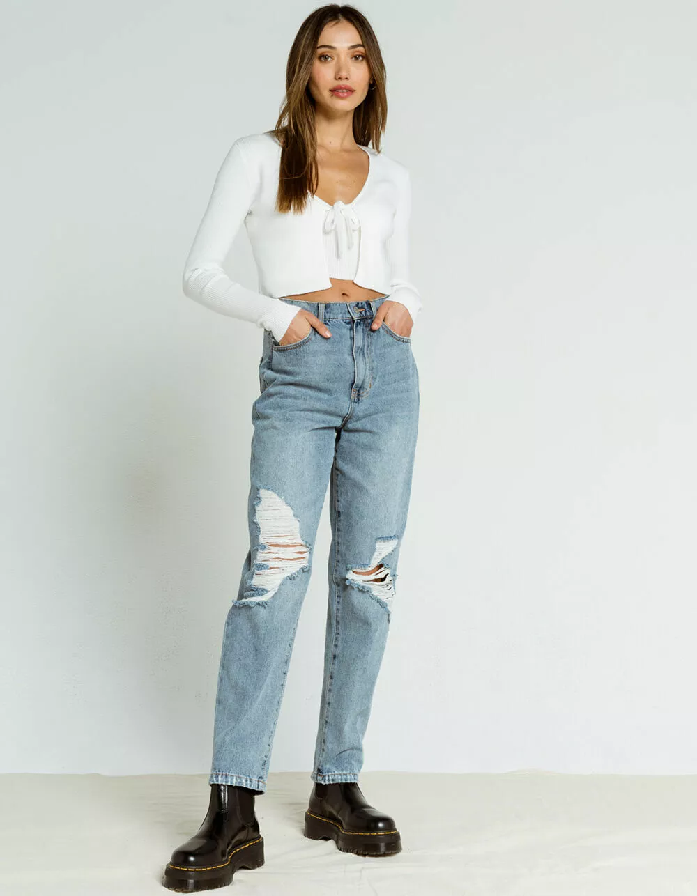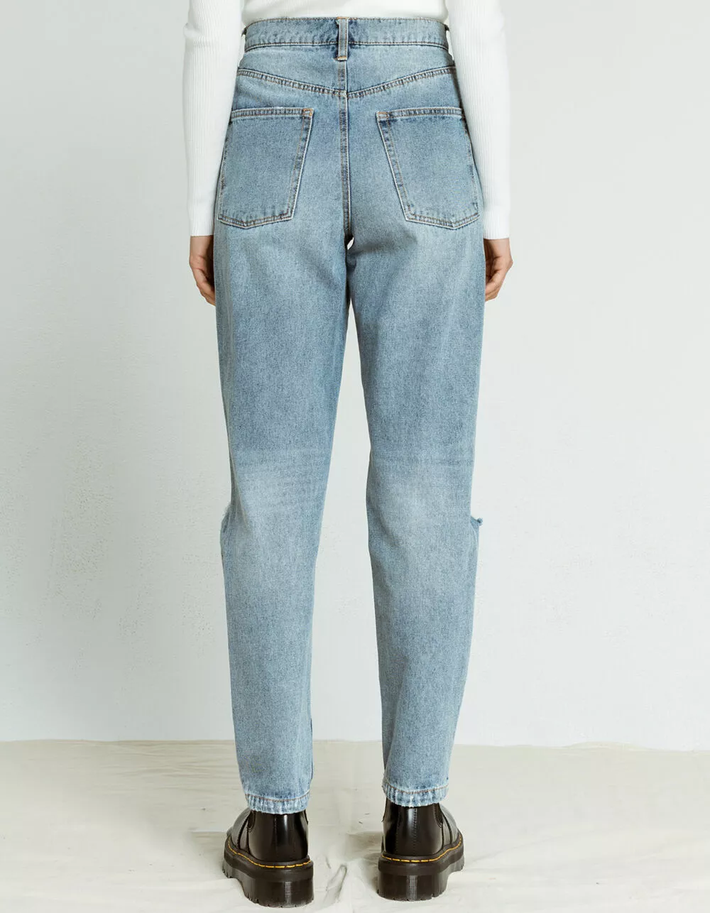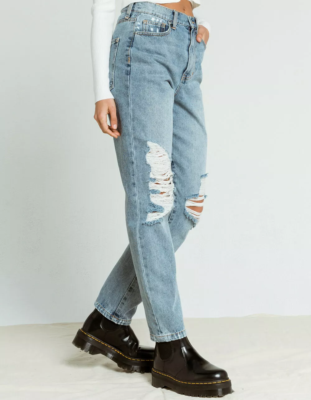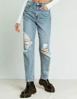 RSQ Destroyed 90s Jeans. Faded wash denim jeans with allover distressing and ripped knees. 5-pocket styling. High rise waist. Relaxed straight leg fit. Button waist and zip fly. Approx. inseam: 30″. Approx. rise: 12″. 100% cotton. Machine wash. Imported.