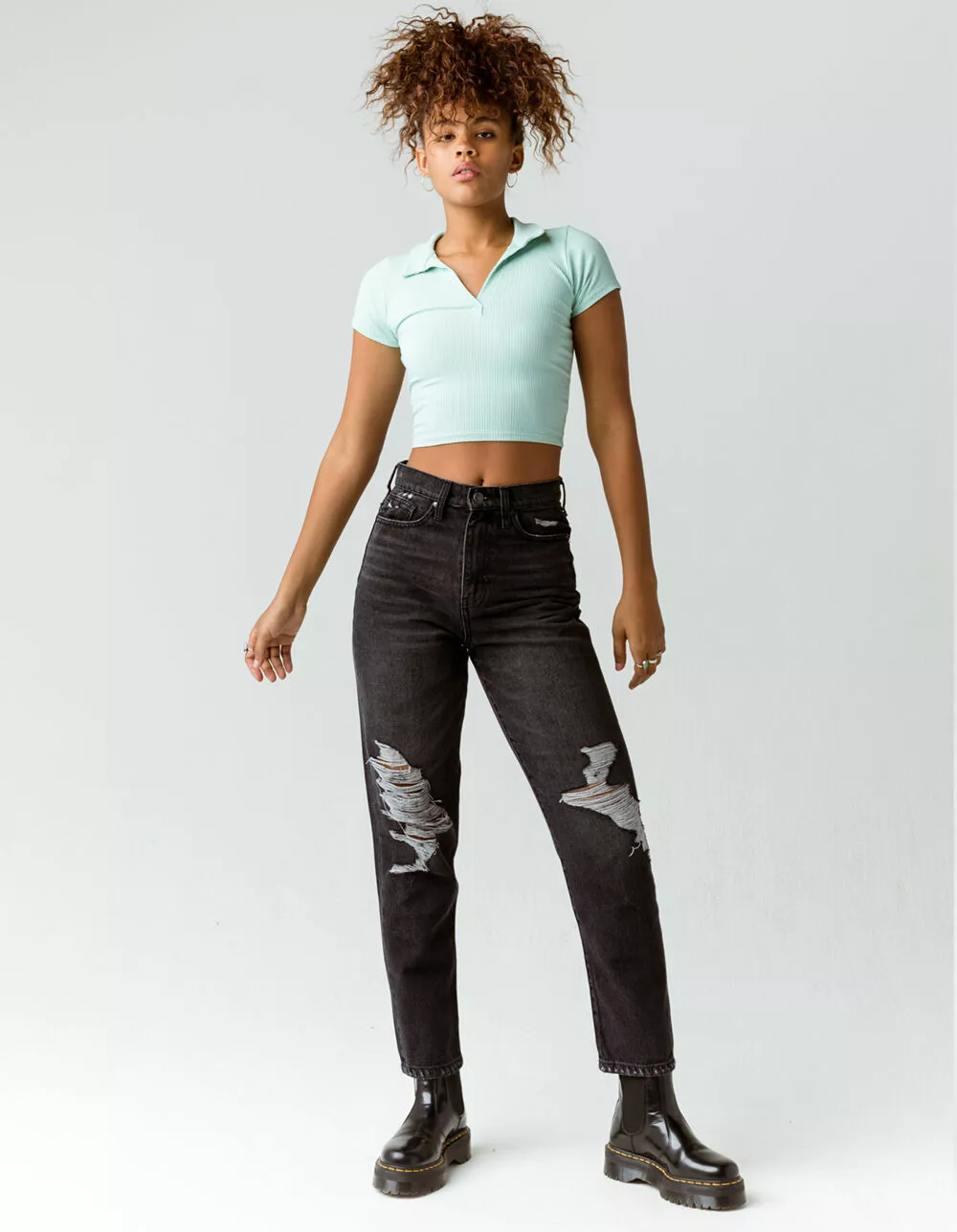 RSQ Destroyed 90s Jeans. Faded wash denim jeans with allover distressing and ripped knees. 5-pocket styling. High rise waist. Relaxed straight leg fit. Button waist and zip fly. Approx. inseam: 30″. Approx. rise: 12″. 100% cotton. Machine wash. Imported.