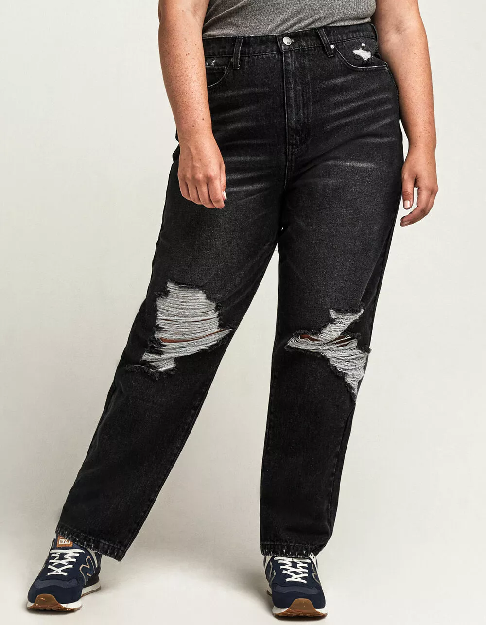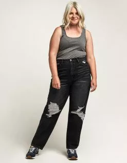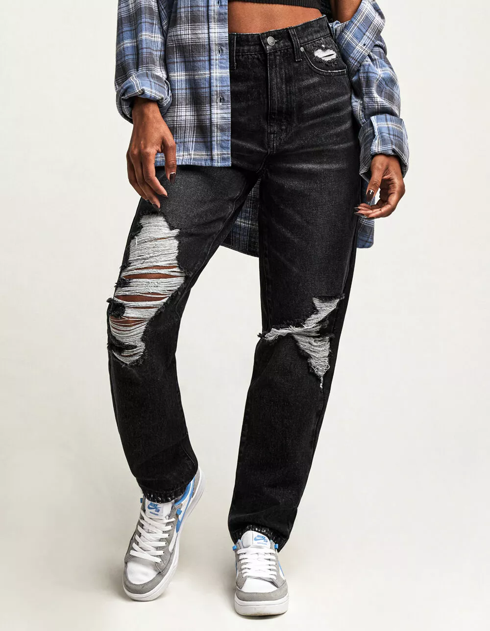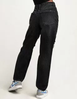 RSQ Destroyed 90s Jeans. Faded wash denim jeans with allover distressing and ripped knees. 5-pocket styling. High rise waist. Relaxed straight leg fit. Button waist and zip fly. Approx. inseam: 30″. Approx. rise: 12″. 100% cotton. Machine wash. Imported.