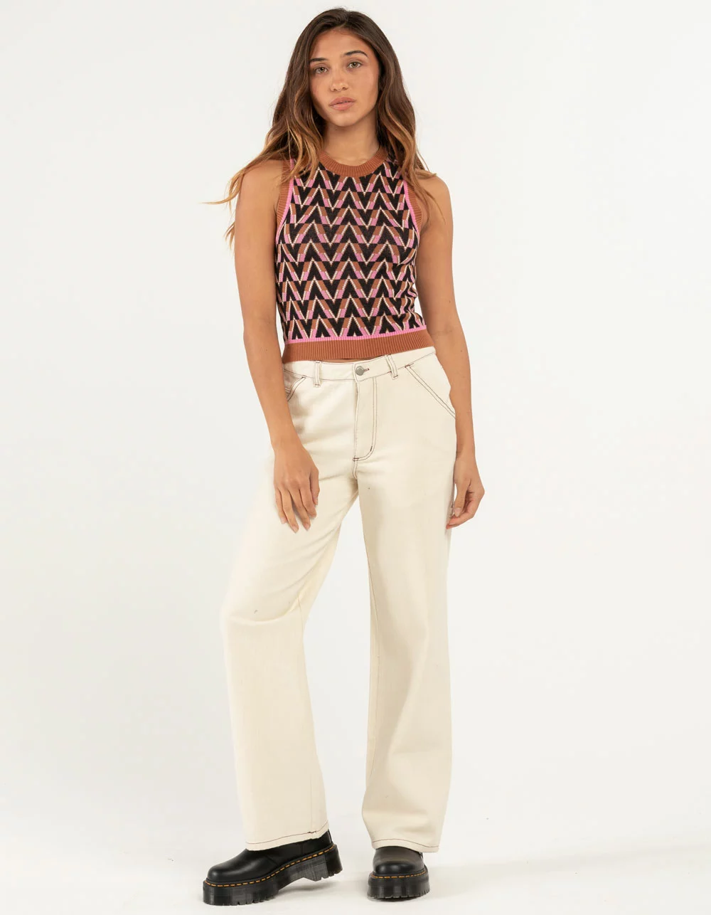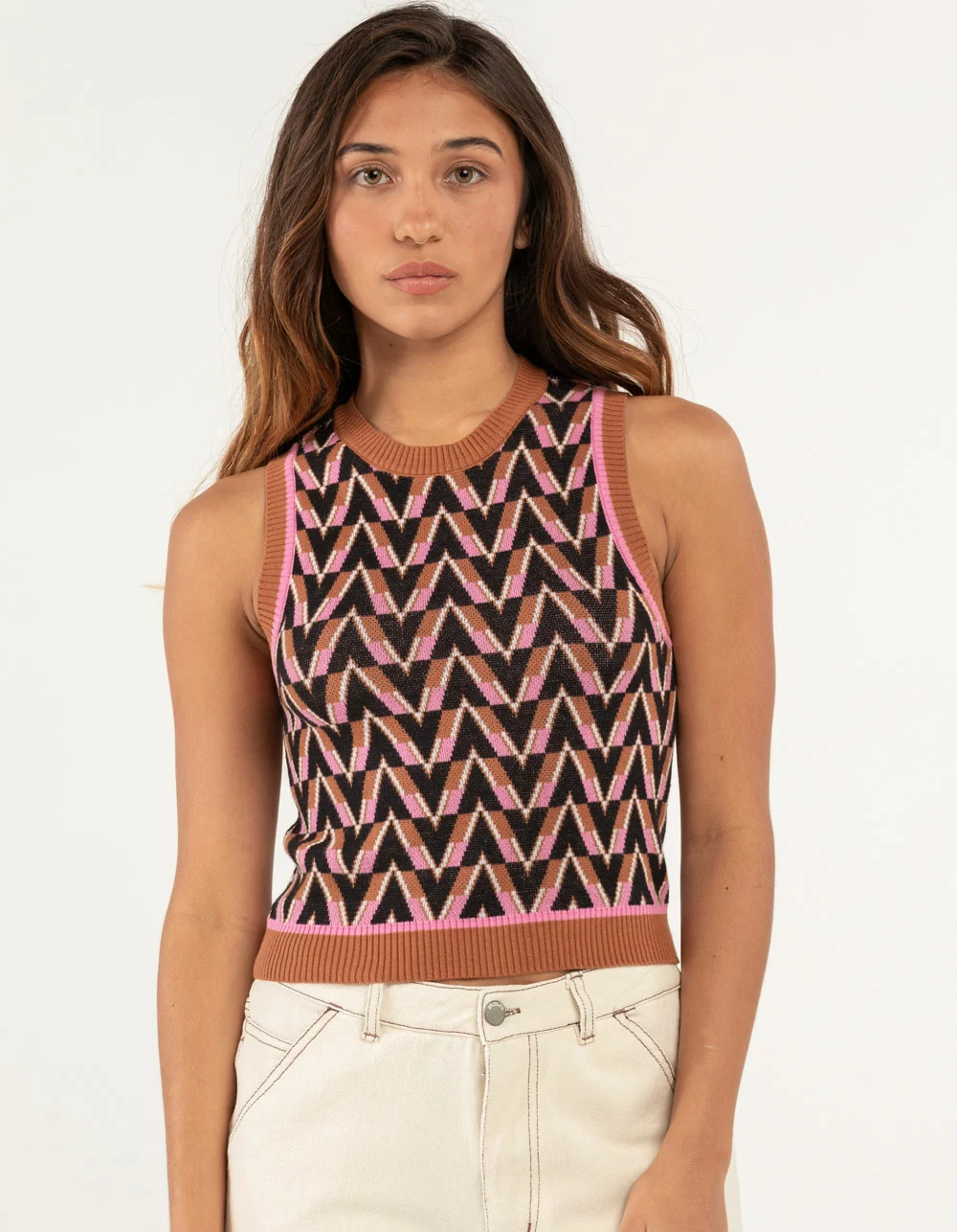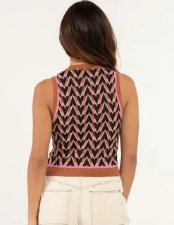 RSQ Geometric Print Sweater Vest. Crew neckline. Geometric pattern. Sleeveless. Ribbed trim with stripe design. 100% Cotton. Machine wash. Imported.