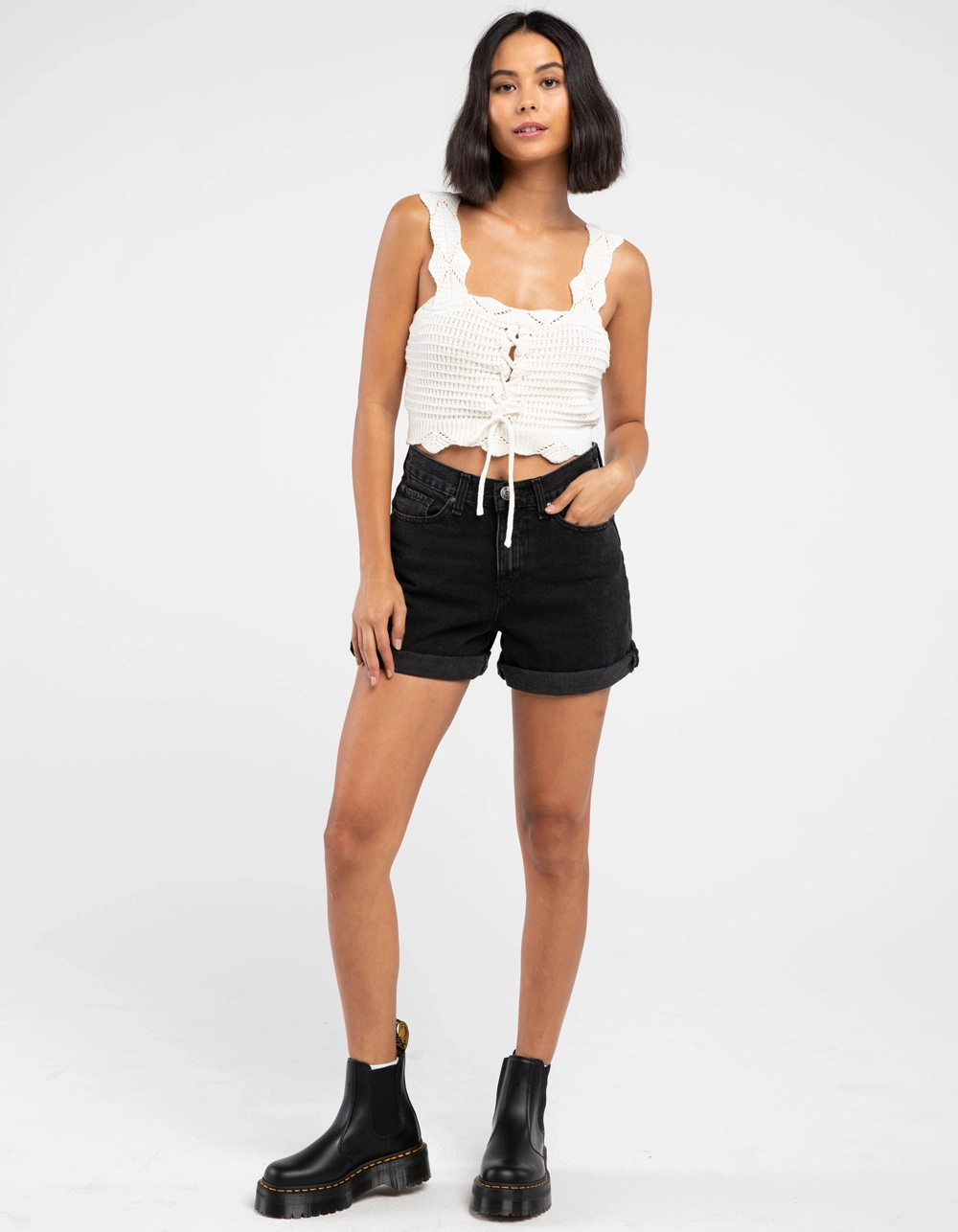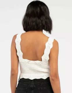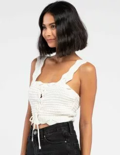 RSQ Lace Up Crochet Cami. Fixed wide straps. Square neckline. Tie front. All over crochet design. Ribbed trim design. 100% Cotton. Machine wash. Imported.