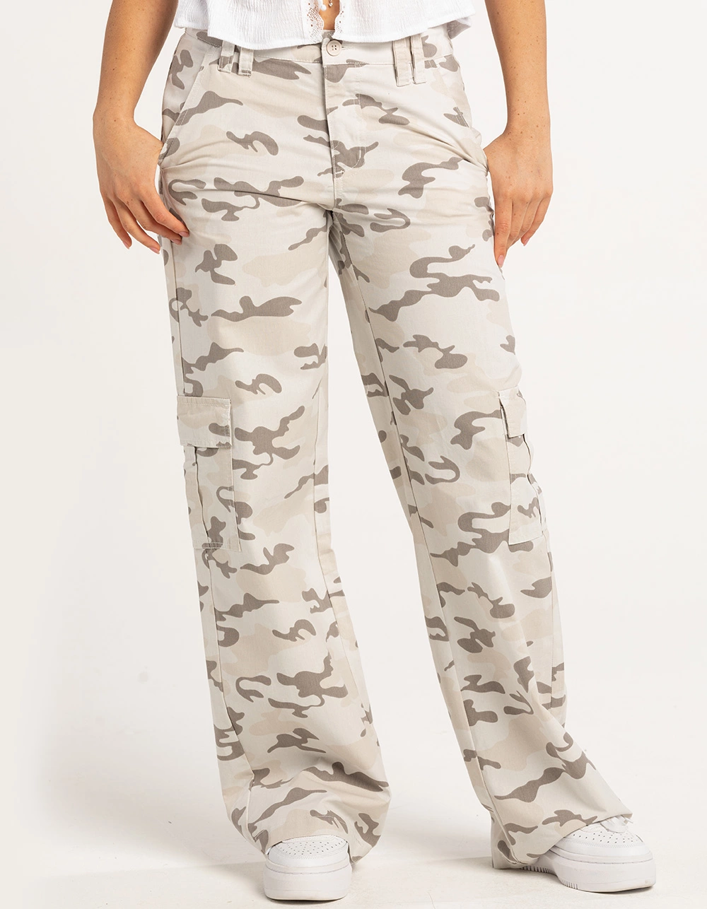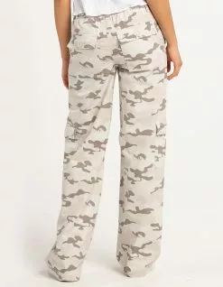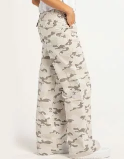 RSQ Low Rise Canvas Cargo Pants. Allover camo print. Zipper fly with button closure. Belt loop waist. Elastic waistband. Multiple pockets for ample storage. straight leg. Baggy fit. Approx. inseam: 32”. 100% Cotton. Machine wash. Imported.