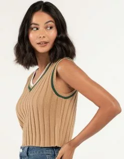 RSQ Preppy Tipping V Neck Vest. Wide ribbed detail with stripes at neckline & arm openings. Sleeveless . Raw hem. 60% Cotton 40% Acrylic. Machine wash. Imported.