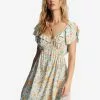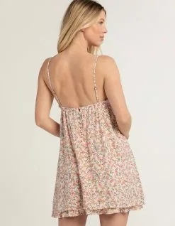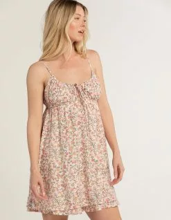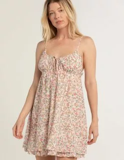 RSQ Print Tier Slip Dress. Allover floral print. Scoop neckline. Keyhole tie at the chest. Adjustable spaghetti straps. Elastic waist. Built in slip. Partial button closure in the back. Approx. length: 30”. Self: 80% Rayon, 20% Polyester. Lining: 100% Polyester. Machine wash. Imported.