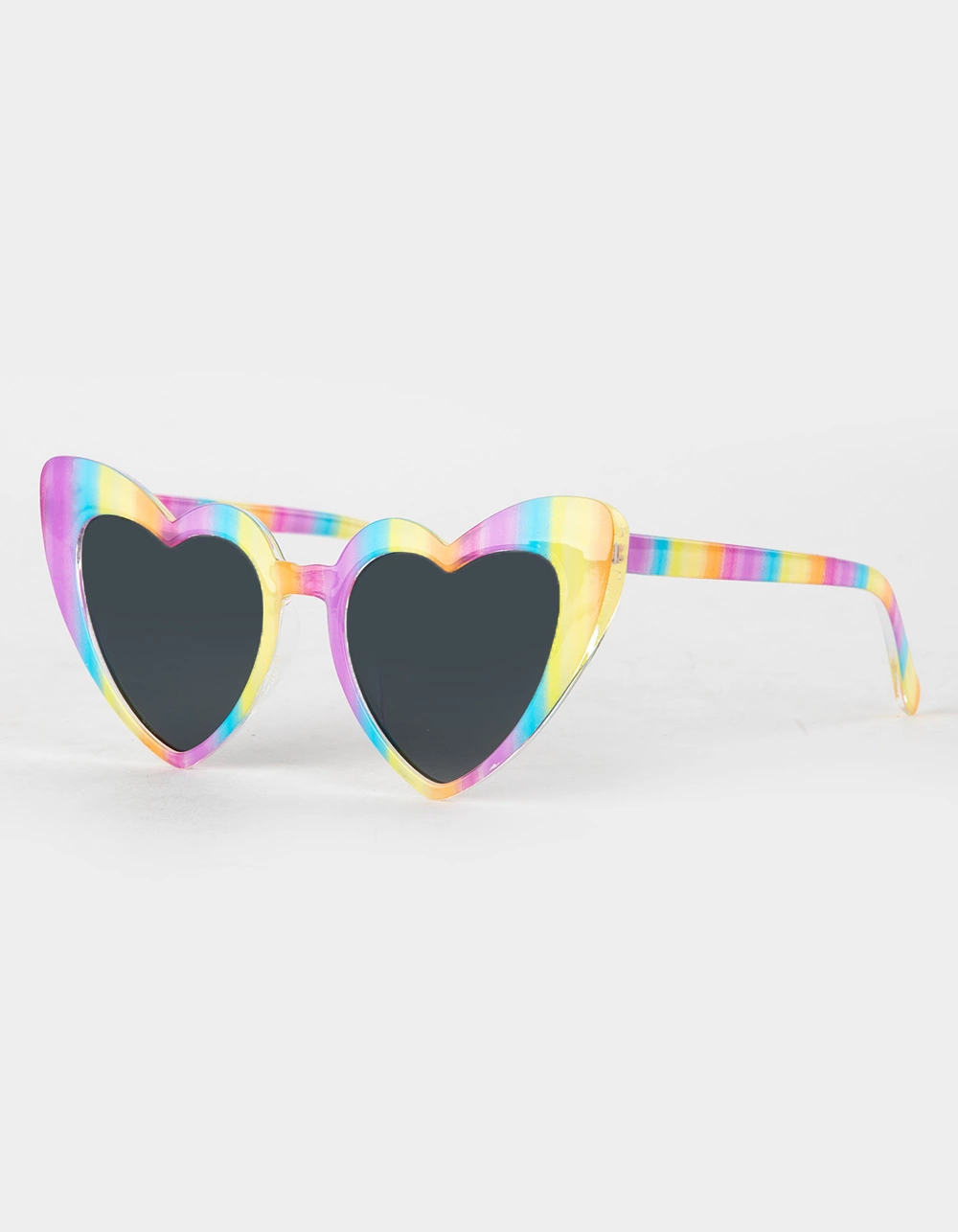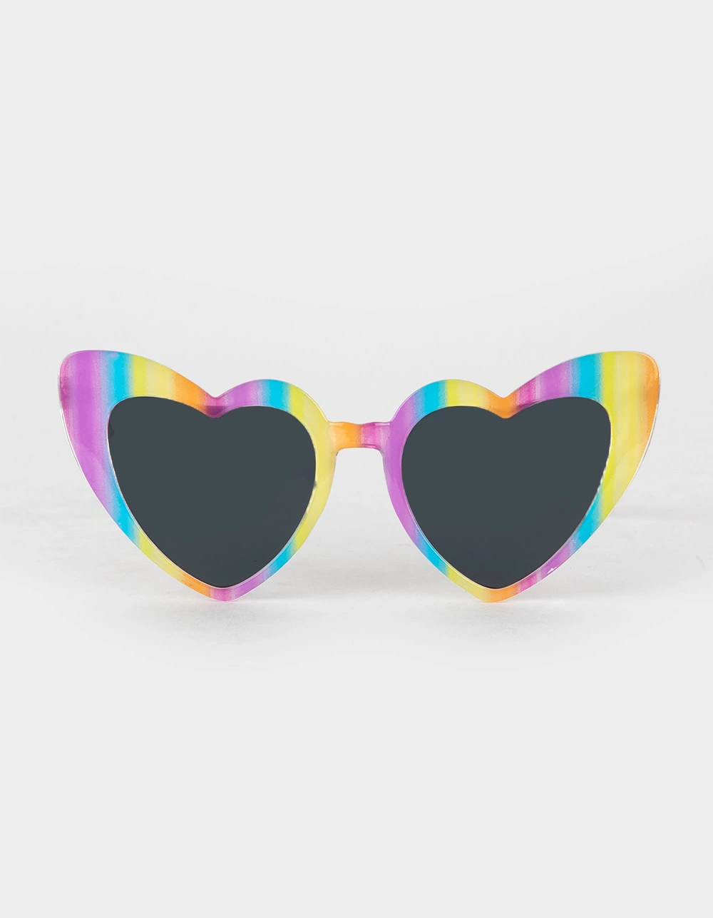 RSQ Rainbow Heart Sunglasses. Get ready to spread love and rainbows wherever you go with a pair of rainbow heart-shaped sunglasses! These fun and funky shades feature colorful rainbow heart-shaped frames that will make you feel like you’re living in a dream world. Plastic frames with nose guards. Dark tinted lenses. Imported. California Residents: WARNING PROP 65: This product can expose you to Bisphenol A (“BPA”), a chemical known to the State of California to cause cancer, birth defects and other reproductive harm. For more information go towww.P65Warnings.ca.gov.