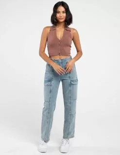 RSQ Solid Johnny Collar Halter Top. Solid color. Pullover halter top. Button front closure. Open low back. V-Neckline. Johnny Collar. 50% Rayon 28% Polyester 22% Nylon. Machine wash. Imported.