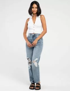 RSQ Solid Johnny Collar Halter Top. Solid color. Pullover halter top. Button front closure. Open low back. V-Neckline. Johnny Collar. 50% Rayon 28% Polyester 22% Nylon. Machine wash. Imported.