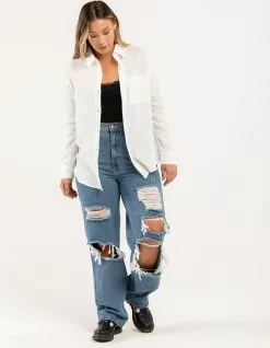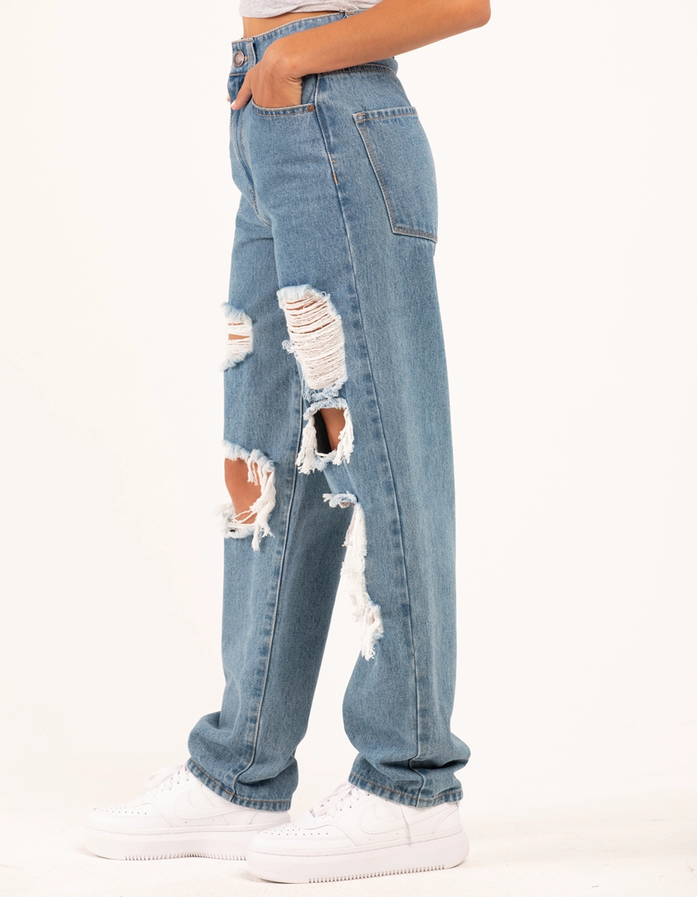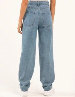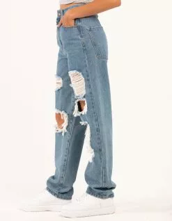 RSQ Baggy Jeans. Classic wash denim with no stretch. 5-pocket styling. Ultra baggy fit. High rise waist. Distressed front with ripped knees. Button waist and zip fly. Approx. inseam: 32″. 80% cotton/20% organic cotton. Machine wash. Imported.