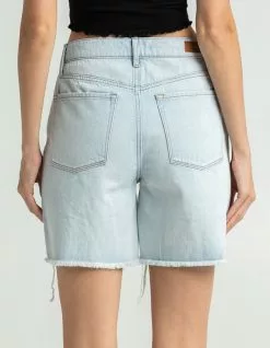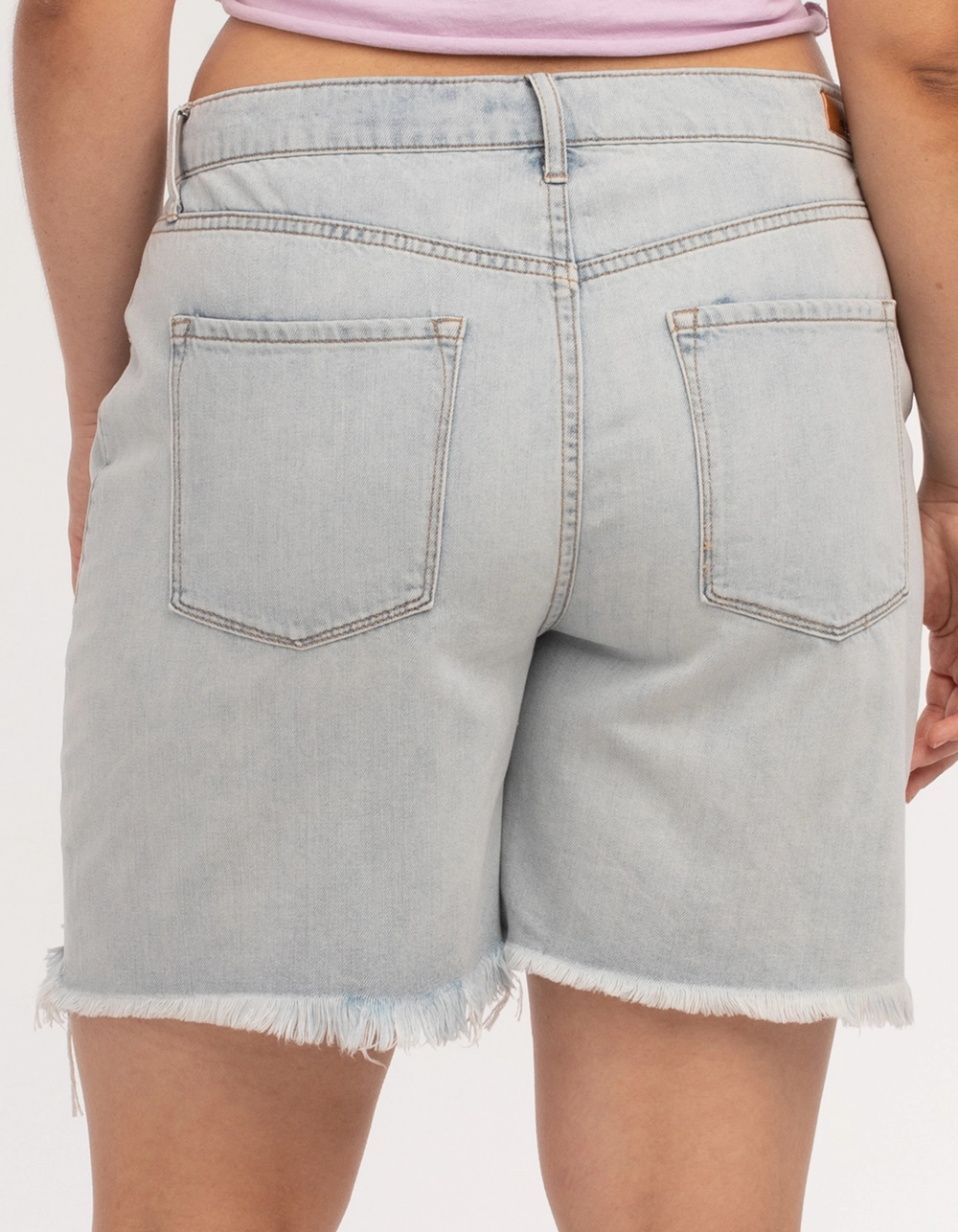 RSQ Boyfriend Shorts. Denim shorts feature distressed details. Mid-rise waist. Boyfriend fit. Raw cutoff hems. 5-pocket styling. Button waist. Zip fly. RSQ logo patch at back right waist. Approx. inseam: 6″. 100% cotton. Machine wash. Imported.