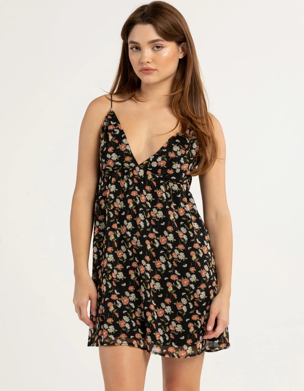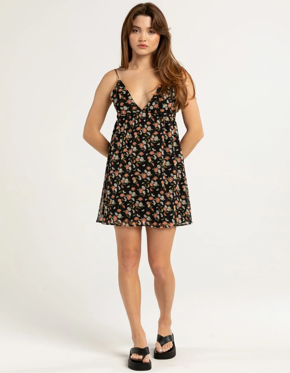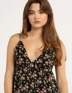 RSQ Chiffon Slip Dress. Allover floral print. Plunging v-neckline. Elastic spaghetti straps. Back tie. Built in slip. Approx. length: 32”. 100% Polyester. Machine wash. Imported.
