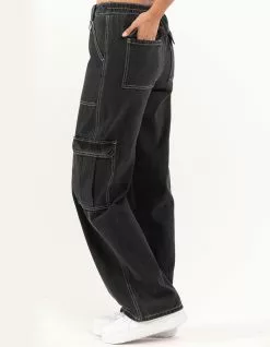 RSQ D Ring Cargo Loose Pants. Button front with zipper fly. Elasticized waistband at back. D Ring deatil. Contrast stitching. Slant hand pockets. Back patch pockets. Cargo pockets. Wide belt loop waist styling. Wide leg fit. Approx. inseam: 32.5′. 100% Cotton. Machine wash. Imported.