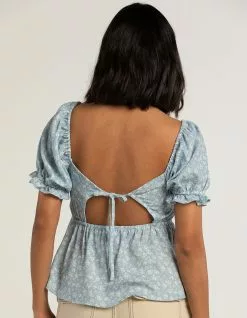 RSQ Ditsy Floral Smock Open Back Top. Allover floral print. Smocked bodice. Puff sleeves with ruffle hem. Elastic waist. Partially exposed back with a tie closure. 100% Polyester. Machine wash. Imported.