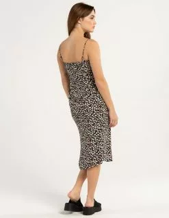 RSQ Emma Midi Dress. Allover floral print. Cinched scoop neckline with a tie. Adjustable spaghetti straps. Leg slit. Approx. length: 42.5”. Shell: 100% Rayon. Lining: 100% Polyester. Machine wash. Imported.