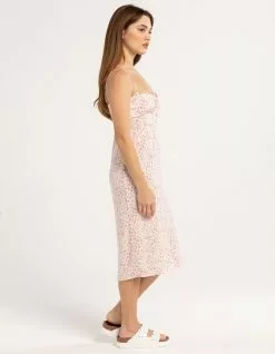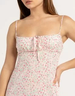 RSQ Emma Midi Dress. Allover floral print. Cinched scoop neckline with a tie. Adjustable spaghetti straps. Leg slit. Approx. length: 42.5”. Shell: 100% Rayon. Lining: 100% Polyester. Machine wash. Imported.