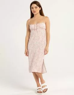 RSQ Emma Midi Dress. Allover floral print. Cinched scoop neckline with a tie. Adjustable spaghetti straps. Leg slit. Approx. length: 42.5”. Shell: 100% Rayon. Lining: 100% Polyester. Machine wash. Imported.