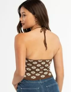 RSQ Halter Top. Allover pattern. Sweater knit construction. Scoop neckline paired with self ties. Sleeveless. Fitted, crop silhouette Open back. 85% Polyester 15% Nylon. Hand wash. Imported.