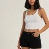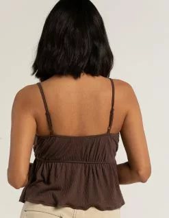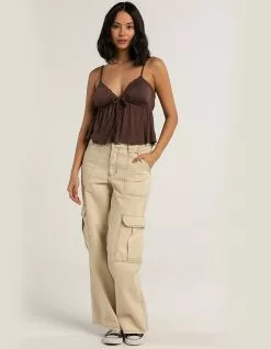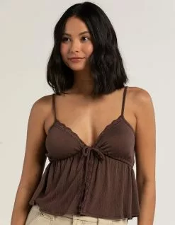 RSQ Flyaway Cami. V-neckline. Lace trim. Open front with tie closure at chest. Adjustable spaghetti straps. 64% Polyester, 34% Rayon, 2% Spandex. Hand wash. Imported.