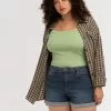 RSQ Womens High Rise Cuffed Denim Shorts. Belt loop & button waist paired with zipper fly. Five pocket design. Rolled cuffs. RSQ label at back right waist. Approx. inseam: 2.5″. 63% Cotton 35% Polyester 2% Spandex Machine wash. Imported.
