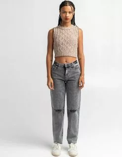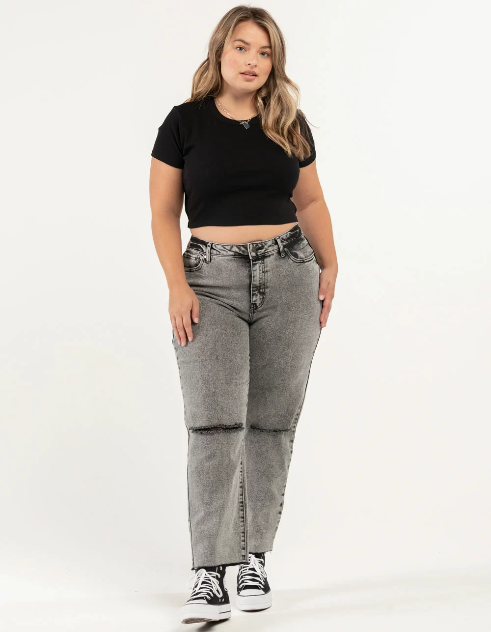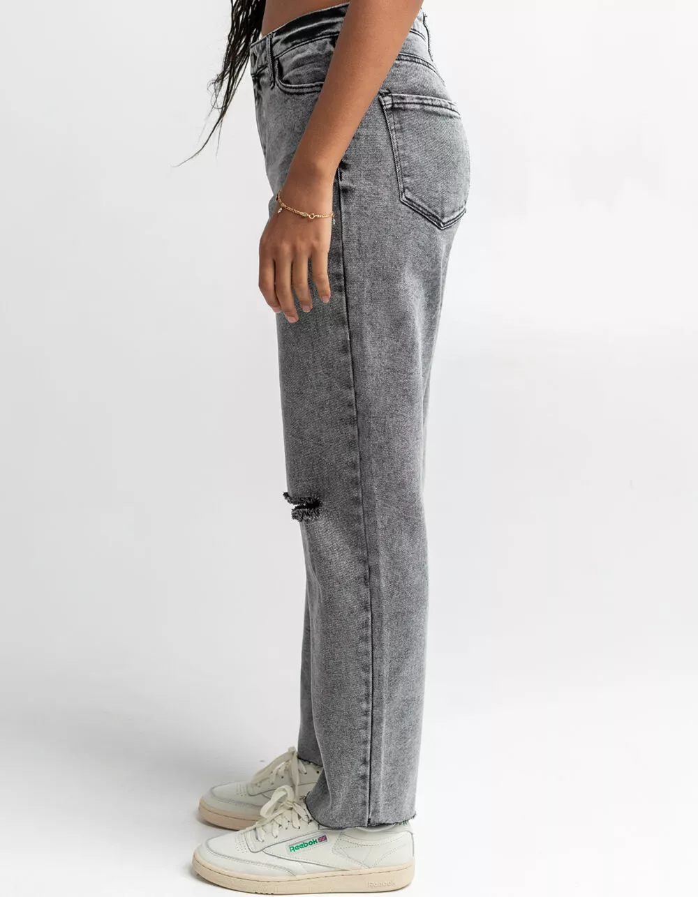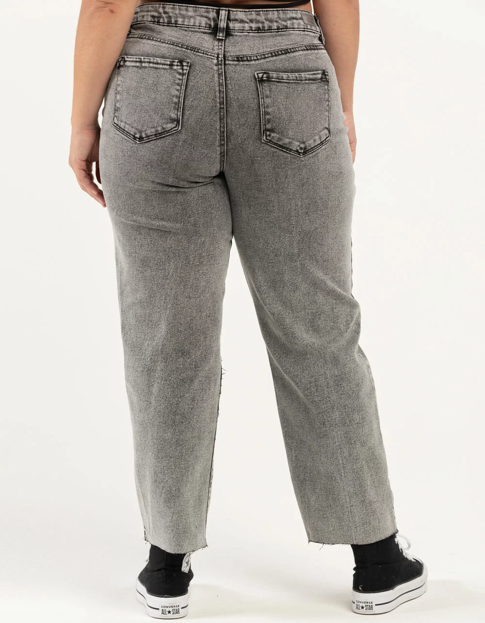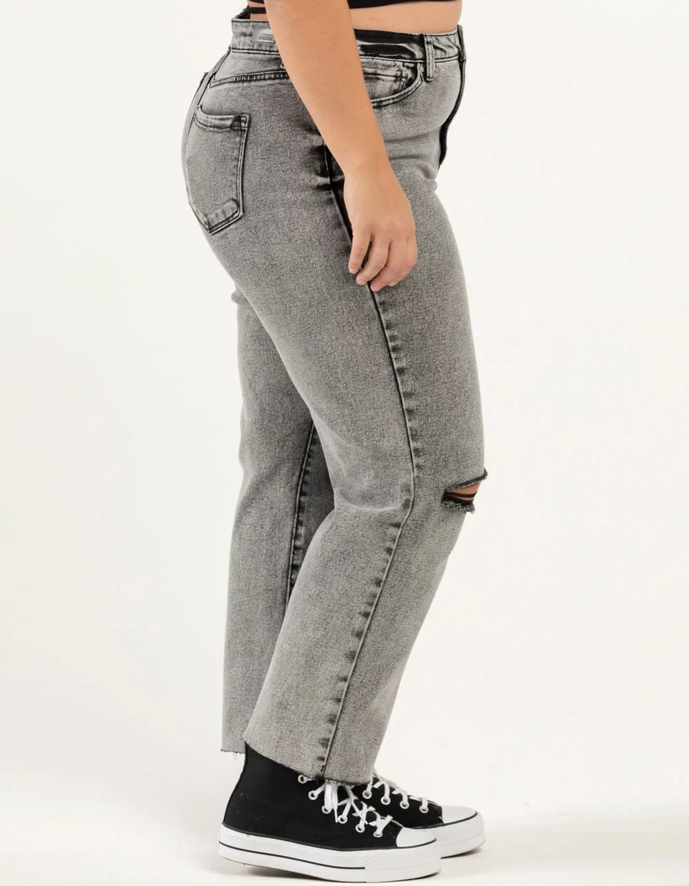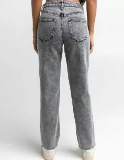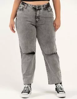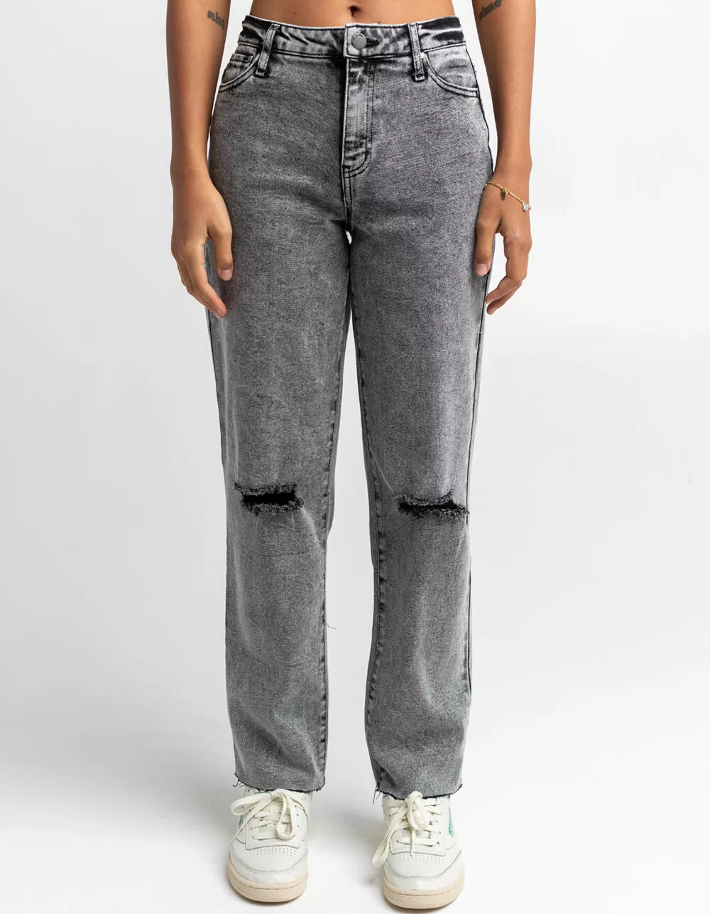 RSQ High Rise Straight Leg Jeans. Button front waist with zipper fly. 5 pocket design. Destructed knee details. Washed fabric. Unfinished cuffs. 67% cotton/28% polyester/3% other fiber/2% spandex. Machine wash. Imported.