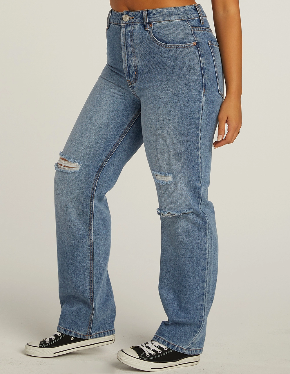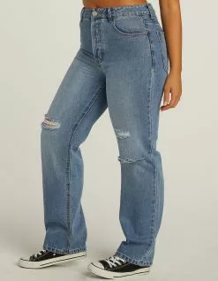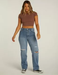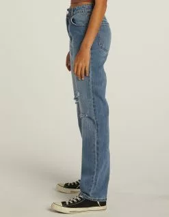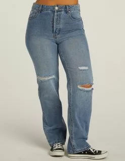 New & Improved Fit! RSQ High Rise Straight Leg Jeans. Rigid Denim. Custom rips at front. High rise. Belt loop waist. Button fly closure. Basic 5 pocket design. Straight leg. Approx. inseam: 31″. 100% Cotton. Machine wash. Imported.