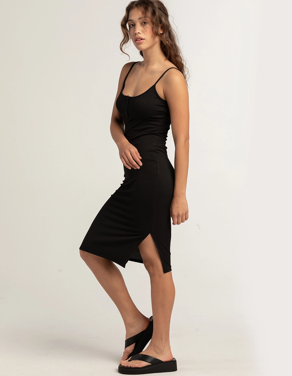 RSQ Knit Bodycon Midi Dress. Rib knit construction. Scoop neckline with partial button front opening. Adjustable spaghetti straps. Side slit. Approx. length. 41.5”. 96% Polyester, 4% Spandex. Hand wash. Imported.