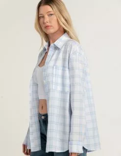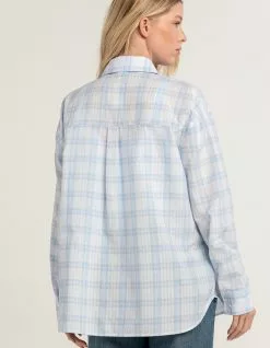 RSQ Lightweight Plaid Boyfriend Shirt. Button front. Flat collar. Patch pocket on left chest. Button cuffed long sleeves. Curved hem. 90% Polyester, 10% Cotton. Hand wash. Imported.