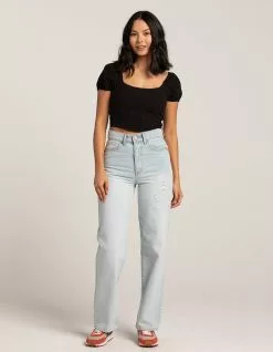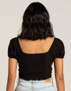 RSQ Linen Corset. Corset style front. Scoop neckline. Puff sleeves. Smocked back. Cropped fit. 100% Cotton. Hand wash. Imported.