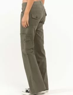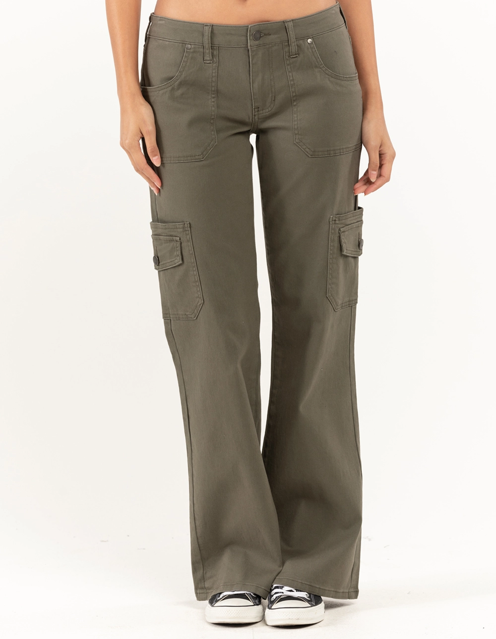 RSQ Low Rise Cargo Flare Pants. Button front with zipper fly. Rounded hand pockets. Back patch pockets and cargo pockets with button closures. Belt loop waist styling. Flared hem. Low rise. Approx. inseam: 32′. Imported.