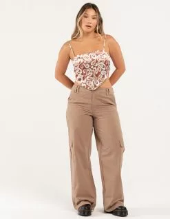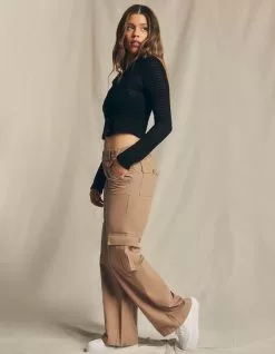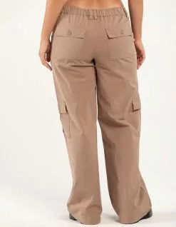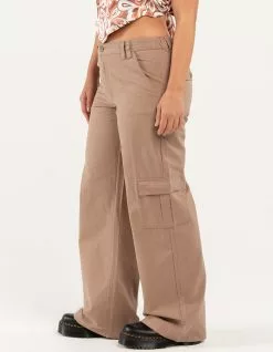RSQ Low Rise Canvas Cargo Pants. Lightweight canvas. Button front with zipper fly. Elasticized waistband at back. Slant hand pockets. Back patch pockets with button closures. Cargo pockets. Dual belt loop waist styling. Wide leg fit. Approx. inseam: 32.5′. 100% Cotton. Hand wash. Imported.
