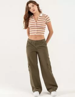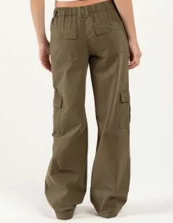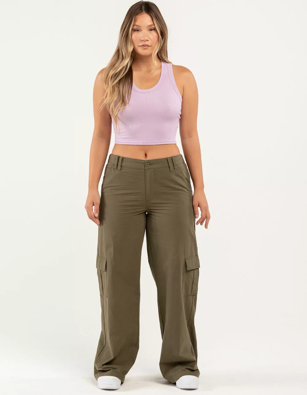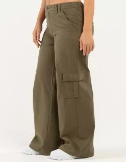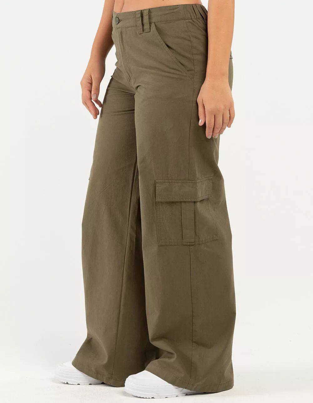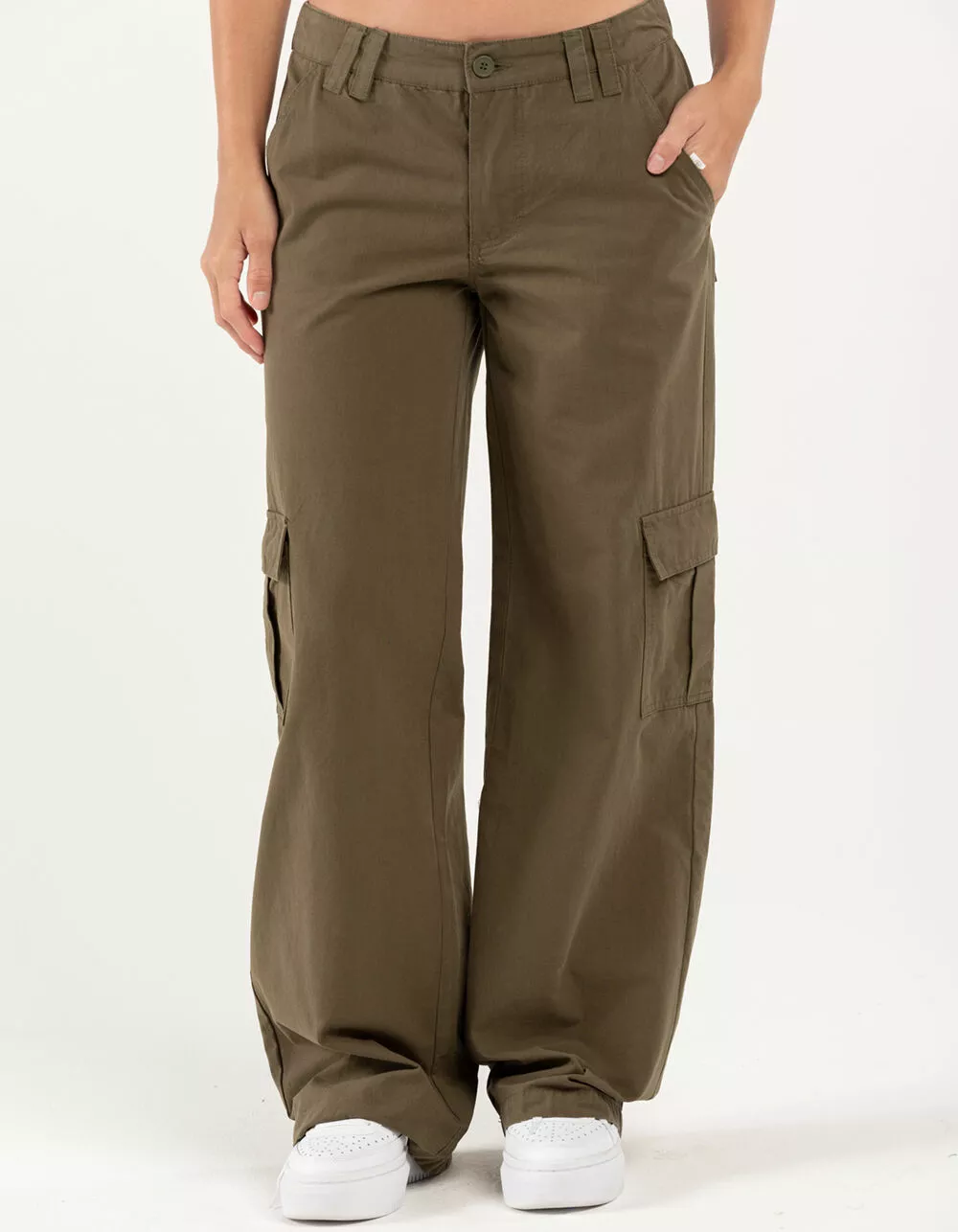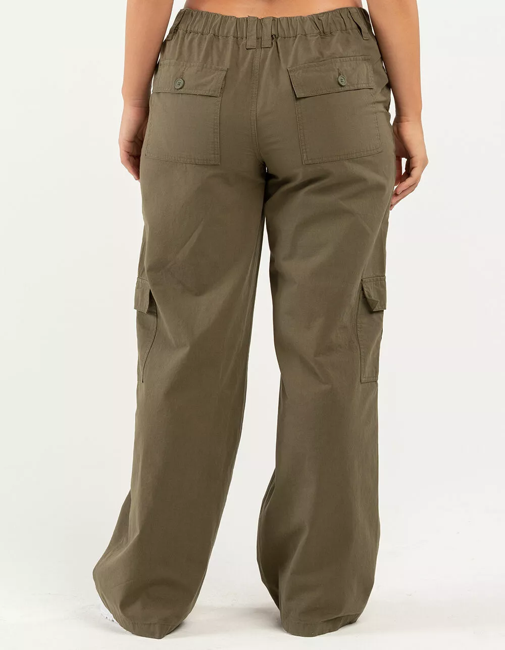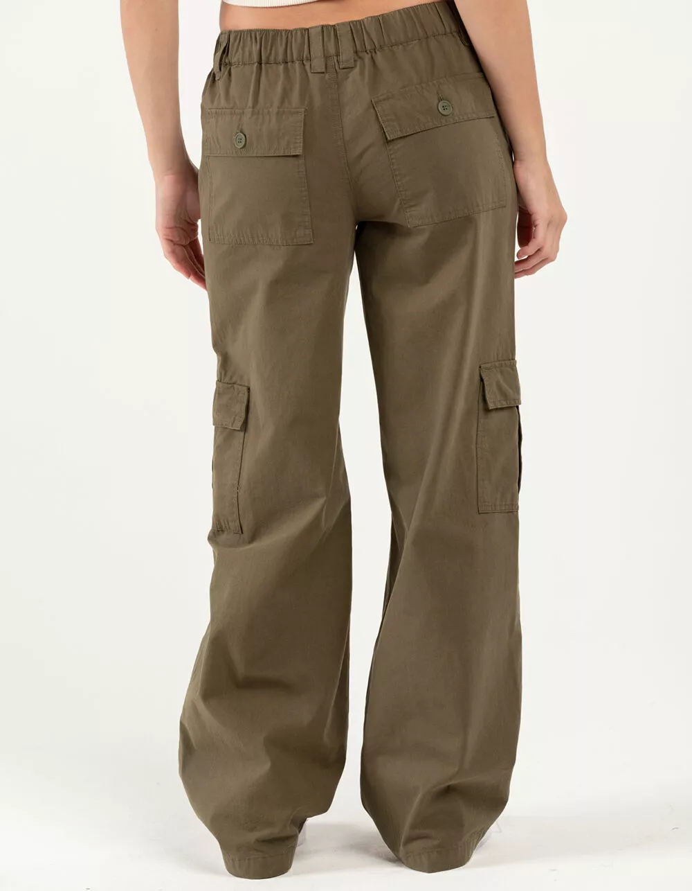 RSQ Low Rise Canvas Cargo Pants. Lightweight canvas. Button front with zipper fly. Elasticized waistband at back. Slant hand pockets. Back patch pockets with button closures. Cargo pockets. Dual belt loop waist styling. Wide leg fit. Approx. inseam: 32.5′. 100% Cotton. Hand wash. Imported.