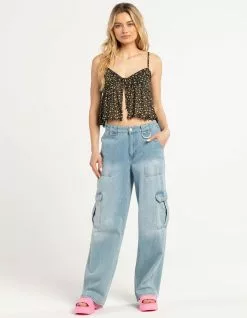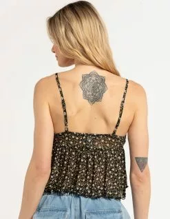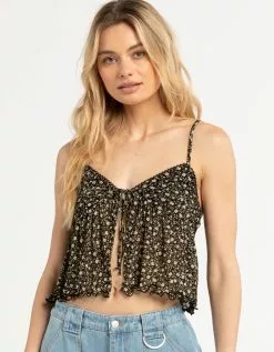 RSQ Mesh Flyaway Cami. Allover floral print. V-neckline with pointelle trim. Open front with tie at chest. Adjustable spaghetti straps. Ruffle trim. Mesh material. 95% Polyester, 5% Spandex. Machine wash. Imported.