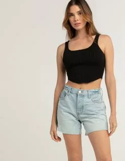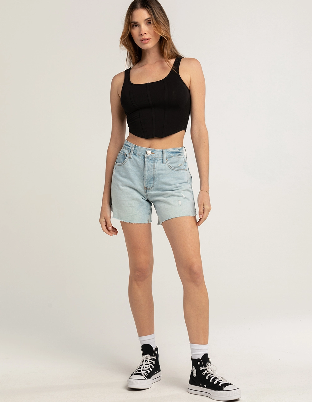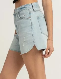 RSQ Mid Length Shorts. Button fly. Belt loop waist. Traditional five pocket styling. Slight distressing. Raw edge hem. Approx. inseam: 5”. 100% Cotton. Machine wash. Imported.