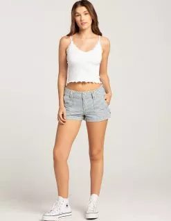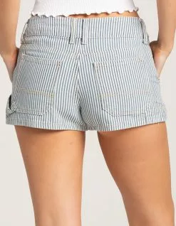 RSQ Mid Rise Stripe Carpenter Shorts. Allover stripe print. Zip fly with two button fasteners. Belt loop waist. Slant hand pockets and back patch pockets. Hammer loop. Approx. inseam: 2.5”. 83% Cotton, 14% Rayon, 3% Other Fiber. Machine wash. Imported.