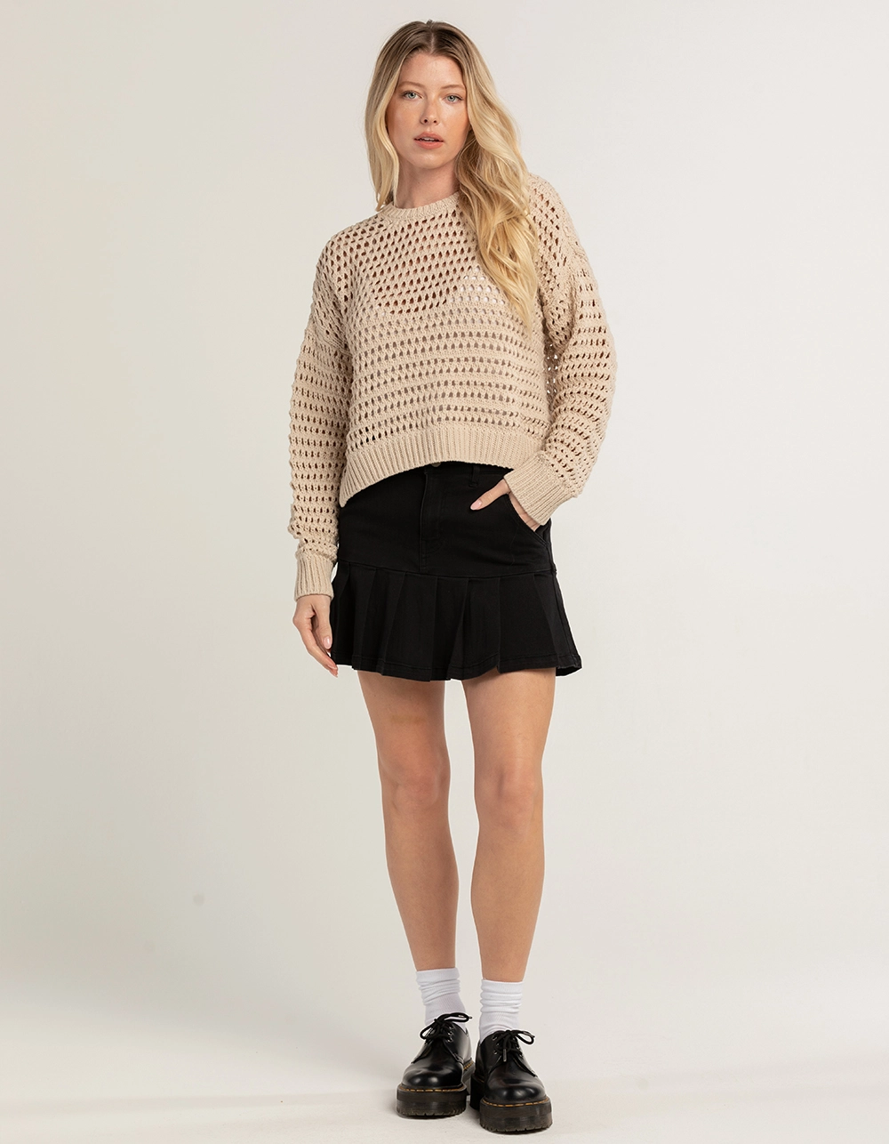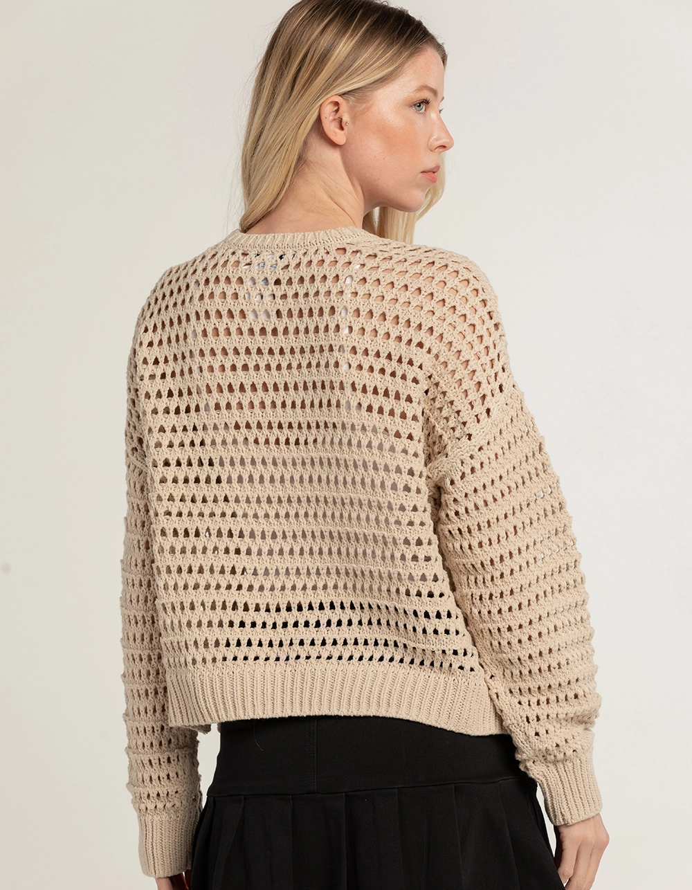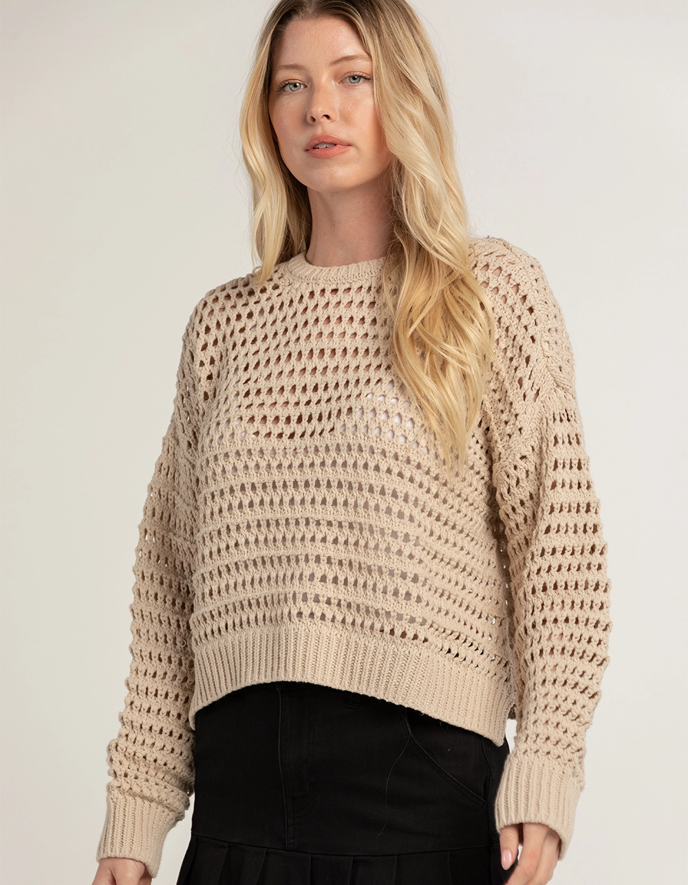 RSQ Open Weave Boyfriend Pullover Sweater. Open weave construction. Ribbed crew neckline. Rib cuffed long sleeves and hem. 60% Cotton, 40% Acrylic. Machine wash. Imported.